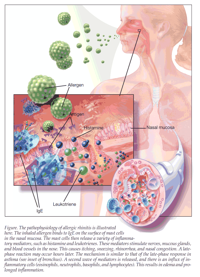 This allergic reaction is typically divided into a 2-phase response: an early phase and a late phase. The early phase of AR occurs within minutes of allergen exposure and is characterized by sneezing, pruritus, rhinorrhea, and nasal congestion. It is produced by activation of tissue mast cells sensitized by IgE antibodies (Figure).