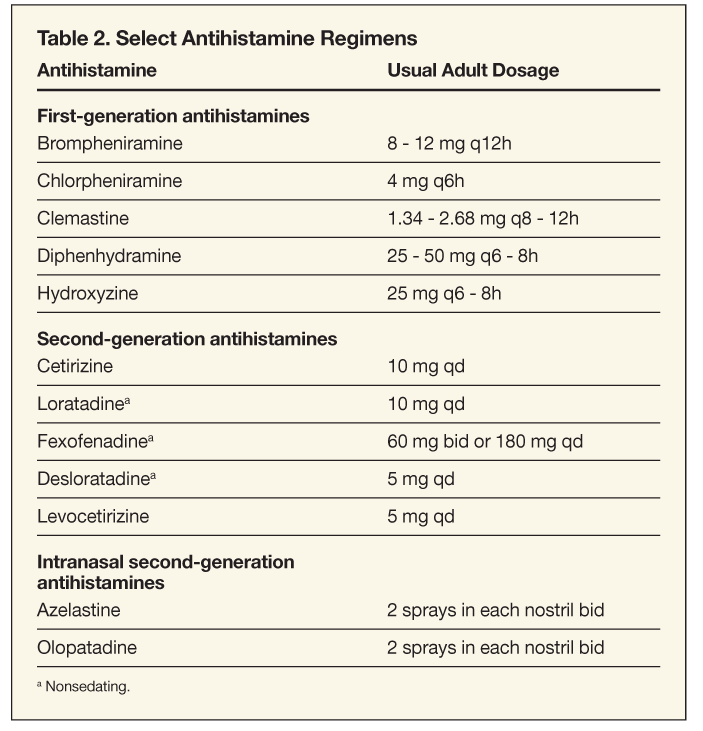 It has been erroneously suggested that the soporific adverse effects of first-generation antihistamines may be managed by taking medications before bedtime. However, studies prove that this strategy leads to drowsiness and decreased concentration the following day.25 The decrease in productivity secondary to these adverse effects clearly negates any perceived cost benefit when compared with second-generation medications.