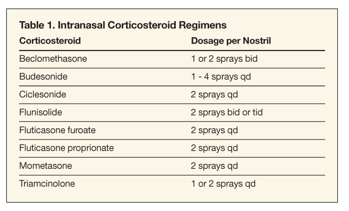 Intranasal corticosteroids act by controlling the rate of protein synthesis, thereby inhibiting the release of mediators by inflammatory cells. This leads to vasoconstriction, which reduces edema and decreases influx of inflammatory cells into the nasal mucosa.15,21 Despite differences in lipid solubility, bioavailability, potency, and preparation (aqueous vs aerosol), there do not appear to be any clinically significant differences in efficacy among the available intranasal corticosteroids.11