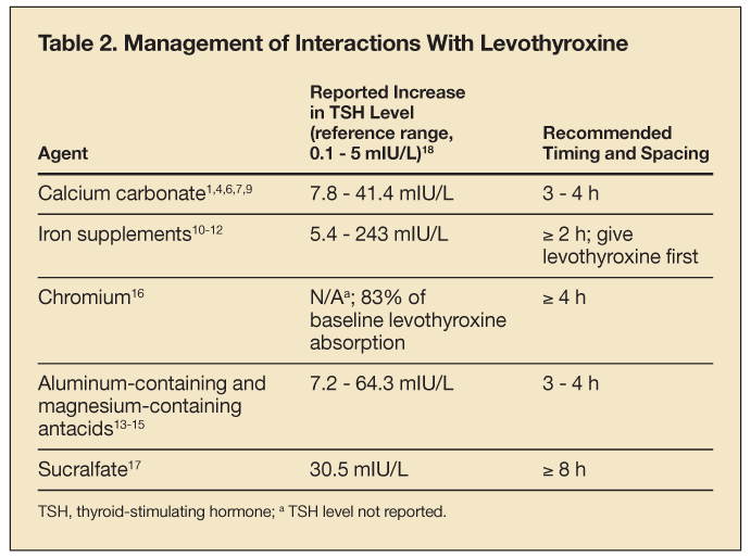 Management of these interactions can be resolved by discontinuing the interacting drug or supplement; if this is not possible, advise patients to separate the doses of the 2 agents (Table 2). For patients who are receiving long-term supplementation with iron or calcium, more frequent monitoring or adjustment of the levothyroxine dose may be required.