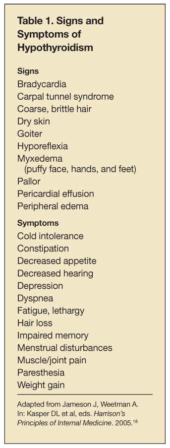 Frequent screening for drug interactions is prudent in persons who are receiving levothyroxine therapy. Consider the possibility of a drug interaction when patients present with worsening signs and symptoms of hypothyroidism (Table 1). A thorough medication history should include questions about use of OTC medications, such as antacids and laxatives, and dietary supplements, in order to identify divalent and trivalent cations. These products may be used by patients to treat symptoms of hypothyroidism, such as constipation. In addition, many postmenopausal women receive levothyroxine therapy; therefore, concurrent use of calcium supplements is likely.