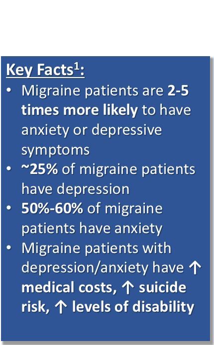 Smitherman TA, Baskin SM. Depression and Anxiety in Migraine Patients. American Migraine Foundation. https://americanmigrainefoundation.org/resource-library/depression-and-anxiety-in-migraine-patients/. Accessed May 13, 2019.