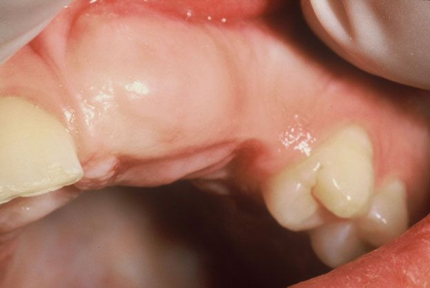 Examination showed that the patient lacked the maxillary left incisors and cuspid tooth. There was a raised area of approximately 1.5 cm in the area where the teeth should have been located (Figure 1). The tissue was of normal color and was firm to the touch.