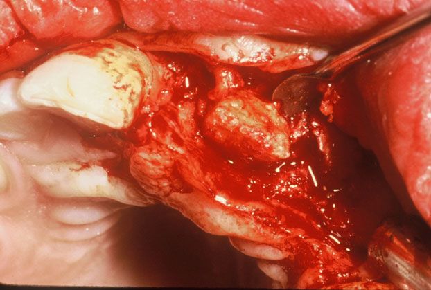 Treatment is somewhat controversial. Some clinicians recommend leaving the structures in place to preserve the alveolar bone, while others recommend surgical removal. Grafting and implant strategies make alveolar reconstruction and tooth replacement very reasonable following surgery.