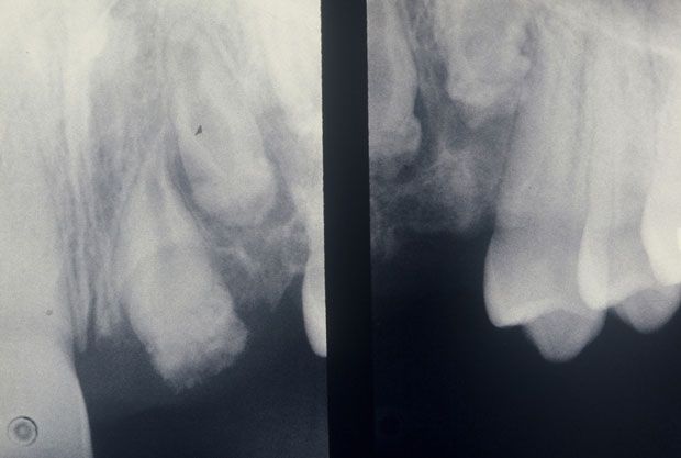 A 16-year-old boy was complaining of pain in the maxillary left incisor/cuspid region. He had been experiencing discomfort for 1 year. He was otherwise healthy and a review of his other systems was unremarkable.