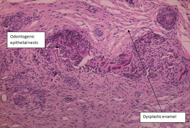 In the primary dentition, teeth may erupt but be malformed and hypocalcified with brown discoloration. In adult or permanent dentition, these structures usually are not erupted. Adjacent permanent teeth erupt normally. Lesions are typically localized to one area, but can occur in multiple regions.