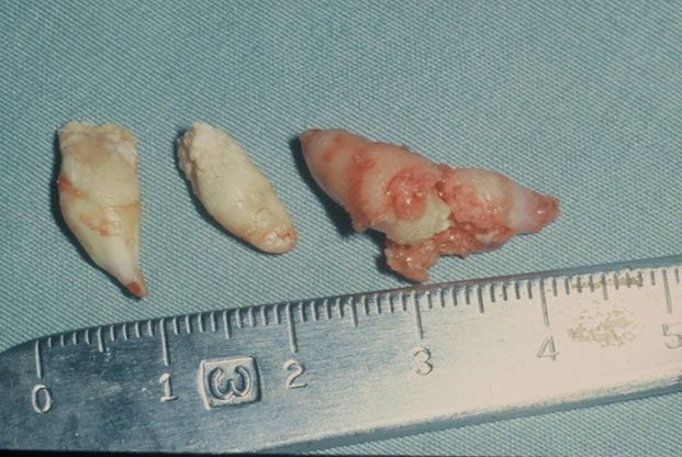 Photograph showing the tooth-like structures removed at biopsy