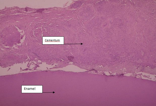 The radicular portion of the biopsied tissue is coated with a layer of cellular cementum of variable thickness (Figure 3, right) with an adjacent layer of fibrous connective tissue. The coronal portion is covered by a thin layer of dysplastic enamel. The structures removed at biopsy are depicted in Figure 4.