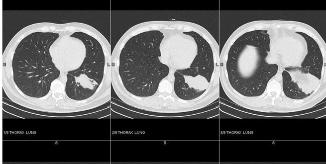A 57-year-old man comes to see you complaining of fevers, chills, and left-sided back pain of a week’s duration. A chest x-ray film shows a dense left-sided infiltrate, and you make a presumptive diagnosis of left lower lobe (LLL) community-acquired pneumonia. You treat him with moxifloxacin 400 mg for 10 days, but after initial improvement in symptoms of fever, chills, and malaise, his back pain persists. A repeated chest x-ray film 1 month later shows persistence of the infiltrate, and you send the patient for a CT scan of the chest. Representative images are shown at right in Figure 1 (top-sagital section), Figure 2 (center-coronoal section), and Figure 3 (bottom-coronal and sagital section, mediastinal view). (Click images to enlarge.)