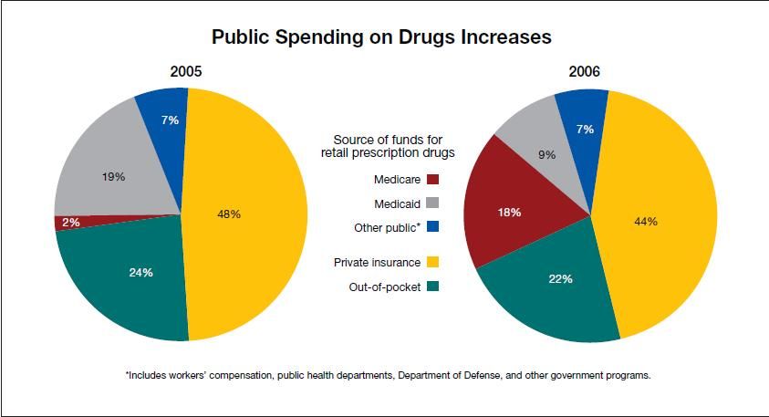 This year’s report reflects the impact of the first full year of Medicare Part D, which caused major shifts in the sources of funds used to pay for prescription drugs. As a result of Part D, the public share of drug spending increased from 28% in 2005 to 34% in 2006 with the private share showing a corresponding decrease from 72% to 66% (Figure 2).