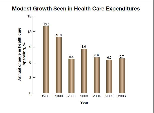 Growth in overall health care spending in 2006 was only slightly faster than the 6.5% rate in 2005 and has moderated in recent years (Figure 1), with slower growth seen in physician services, hospital services, and nursing home care. In 2006, growth in health care spending outpaced nominal gross domestic product (GDP) growth by 0.6 percentage point. Health care spending accounted for 16% of the GDP in 2006, up marginally from 15.9% in 2005 and 2004.