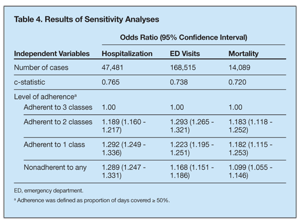 In a second sensitivity analysis, incremental increases in levels of adherence (when adherence level was treated as a continuous vari-able) were also associated with improved health outcomes. With adherence to each additional class of medication (unit = 1 class of medication), there was an 11.8% (OR, 0.882; 95% CI, 0.874 - 0.890; P < .001) reduction in all-cause hospital admissions, a 9.7% (OR, 0.903; 95% CI, 0.898 - 0.908; P < .001) reduction in ED visits, and a 6.0% (OR, 0.940; 95% CI, 0.926 - 0.955; P < .001) reduction in mortality.