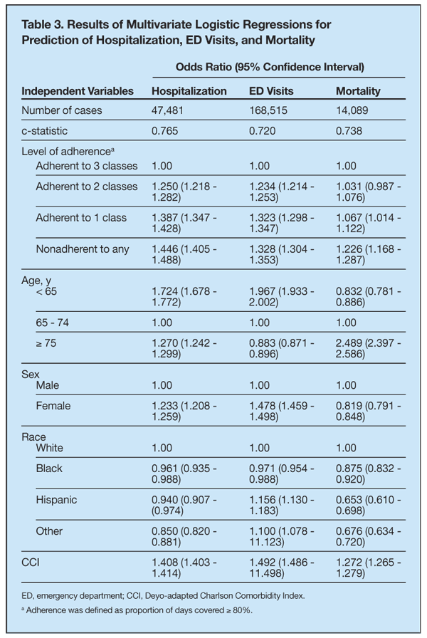 In unadjusted analyses, patients who had lower levels of adherence had higher rates of all-cause hospitalizations, all-cause ED visits, and all-cause death in the follow-up period (Table 2). Table 3 presents the results of multivariate analyses. In multivariate regression models, a lower level of medication adherence was associated with increased risks of all-cause hospitalizations, ED visits, and death, after controlling for confounding variables, including age, sex, race, and comorbidity. For example, compared with patients who were adherent to all 3 classes of medications, patients who were nonadherent to any were 44.6% more likely to be hospitalized for any causes (OR, 1.446; 95% CI, 1.405 - 1.488; P < .001), 32.8% more likely to visit the ED (OR, 1.328; 95% CI, 1.304 - 1.353; P < .001), and 22.6% more likely to die during the follow-up period (OR, 1.226; 95% CI, 1.168 - 1.287; P < .001).