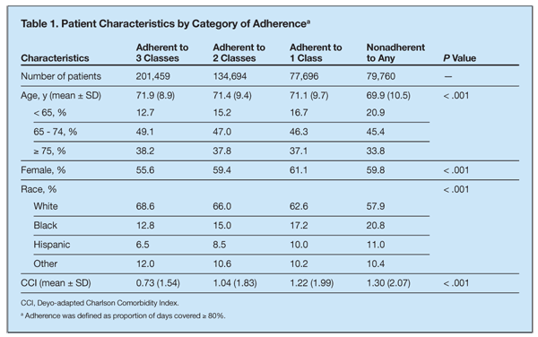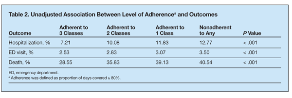 Statistical analysis. Baseline demographics and comorbidity index were compared between patients who were adherent to all 3 classes of medications, those adherent to 2 classes of medications, those adherent to 1 class of medication, and those nonadherent to any class of medication using the χ2 tests for categorical variables and analysis of variance tests for continuous variables.