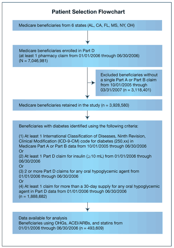 Inclusion criteria. Medicare beneficiaries were identified as having diabetes if they had (1) at least 1 International Classification of Diseases, Ninth Revision, Clinical Modification (ICD-9-CM) code for diabetes (250.xx) in Medicare Part A or Part B data from October 1, 2005, through June 30, 2006; (2) at least 1 claim for insulin (10 mL or more total) in Part D data; (3) 2 or more claims for any oral hypoglycemic agent; or (4) at least 1 claim for more than a 30-day supply for any oral hypoglycemic agent in Part D data from January 1, 2006, through June 30, 2006 (Figure). Since we intended to examine the effect of adherence on patient health outcomes and not to compare users with nonusers of these medications, only beneficiaries who used all 3 classes of medications (hypoglycemic agents, ACEIs or ARBs, and statins) were included.