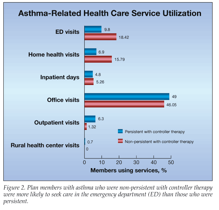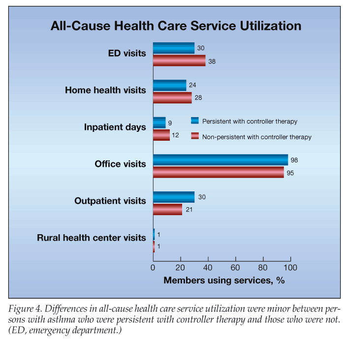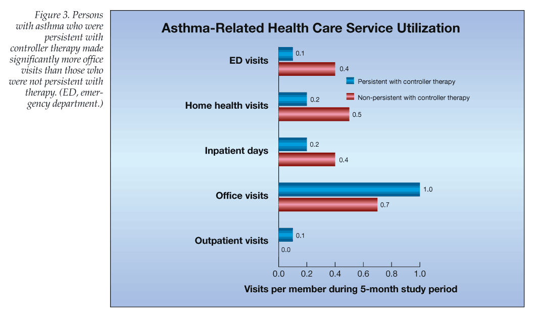 Non-persistent use of controller medications increases the utilization of health care services and medical costs associated with asthma. This study supports the need for targeted interventions, such as refill reminder programs, to address non-persistence to asthma controller medications. We are continuing to investigate the influence of specific controller medications on health care utilization and costs. These data will allow identification of opportunities to optimize appropriate drug therapy and improve outcomes. It remains clear that patient and parental education are key components of disease management approaches that emphasize the appropriate use of medications. Furthermore, health care providers, including primary care physicians and pharmacists, should be made aware of current asthma practice guidelines and their use in promoting adherence to treatment.