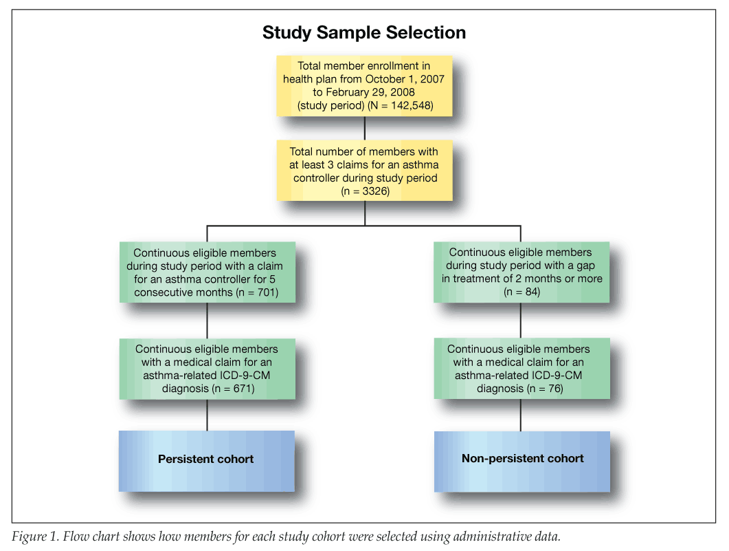 Future analysis will include a longer study period. The intent of the short duration for this study was to identify those members with a recent gap in therapy who could be targeted for interventions before a pattern of nonadherence was established. However, the 5-month study period may have been too short to account for seasonal variations that can influence use of asthma-related services. Moreover, the inclusion criterion of 3 consecutive months of controller medication use may underrepresent the rate of non-persistence with controller therapy. Fu-ture study may also incorporate the use of Current Procedural Technology (CPT) codes to establish treatment of persistent asthma. This will eliminate the need to use pharma- cy claims data to establish chronic treatment.