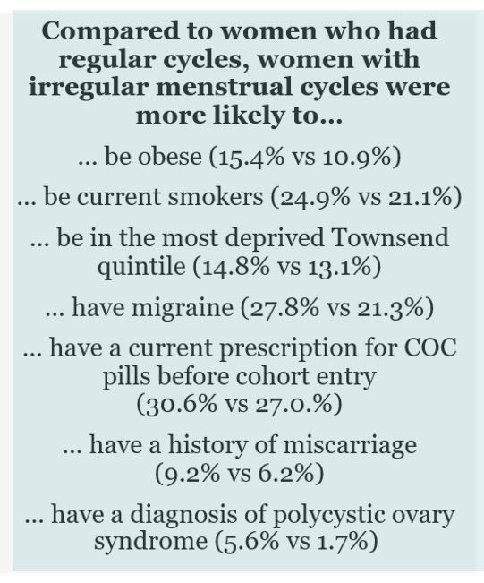 The full cohort numbered 704 743 participants including 215 378 with a history of irregular menstrual cycles and 36 947 with a history of frequent or infrequent cycles. Median age of women in both groups was approximately 27 years.