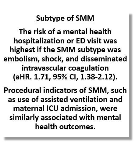 Individuals with SMM had the highest relative risk of hospitalization or ED visit for a mental health condition in the first year post-partum (aHR, 1.38, 95% CI, 1.24-1.53). And, although dissipated somewhat over time, Dayan et al reported risk persisted for those with more than 1 year but fewer than 5 years follow-up (1.23, 95% CI 1.14-1.34), and for those with more than 5 years of follow-up (1.21, 95% CI, 1.07-1.37).
