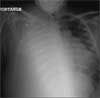 Temperature was 38.6°C (101.4°F); blood pressure, 119/80 mm Hg; heart rate, 121 beats per minute; and respiration rate, 20 breaths per minute. Oxygen saturation measured with pulse oximetry was 98% with a nonrebreather mask and about 80% without a nonrebreather mask. Breath sounds were decreased bilaterally. The abdomen was soft. Extremities were nonedematous. Neurological findings were intact with no focal deficits.