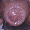 Physical examination of the glans and prepuce may reveal a macular lesion with associated erythema. Attempts to retract the foreskin may result in purulence, excoriation, and erythema of the glans and apposing prepuce.