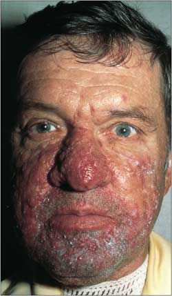 Figure 2 –A close-up view of a third person with rosacea shows striking hypertrophy of the nasal soft tissue constituting advanced rhinophyma. Adjacent portions of cheeks show extensive papule formation and surface irregularity from overgrowth of sebaceous tissue and connective tissue. A tiny venous lake is seen on the left lower lip.