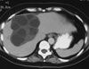 Laboratory studies. White blood cell (WBC) count, 5100/µL, with 60% polymorphonuclear leukocytes, 32% lymphocytes, 4% eosinophils, 4% monocytes. Hemoglobin level, 13.6 g/dL; platelet count, 200,000/µL; erythrocyte sedimentation rate, 8 mm/h. Urinalysis reveals no protein and no bilirubin; WBC count, 2 per high-power field; no red blood cells. Blood glucose level, 84 mg/dL. Blood urea nitrogen level, 18 mg/dL; creatinine, 0.8 mg/dL; serum sodium, 138 mEq/L; potassium, 3.7 mEq/L; chloride, 100 mEq/L; bicarbonate, 22 mEq/L; total bilirubin, 1 mg/dL; conjugated bilirubin, 0.8 mg/dL. Total protein, 8 g/dL; albumin, 4.2 g/dL; globulin, 3.8 g/dL; alkaline phosphatase, 200 U/L; aspartate aminotransferase, 21 U/L; alanine aminotransferase, 20 U/L. Ultrasonography reveals a large cystic lesion in the right lobe of the liver.