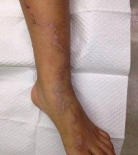 A 6-year-old boy had a 1-month history of an intensely pruritic “rash” on the left dorsal foot and left lower leg. He had a recent history of walking barefoot on a beach in south Florida where dogs are allowed. The migrating lesion stopped just below the knee.