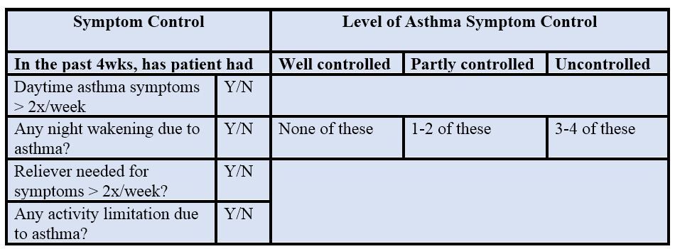 Let’s discuss asthma control first. Asthma symptom control refers to the patient’s current state on his or her present therapy. There are a number of questionnaires and guidelines that can help determine the level of control. The recommended one from the GINA guidelines is summarized in Table 2 above (please click to enlarge).