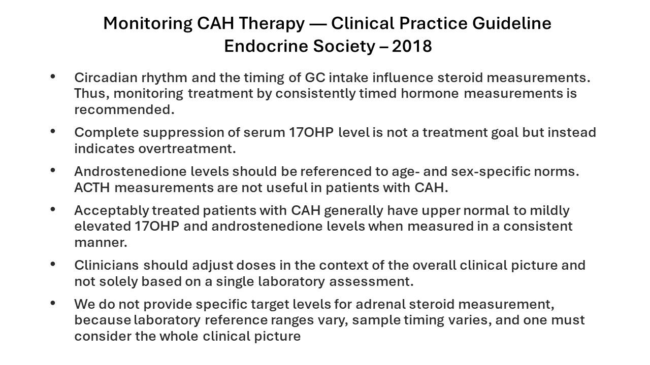 Most importantly when it comes to monitoring the response to GC therapy and decisions to alter dose, guidance echoed throughout the literature both current and past, is that “hormone levels taken at recommended time points should not preclude a full clinical assessment of the patient. Management decisions should take all clinical features and biochemical data into consideration.”13