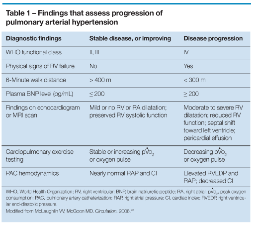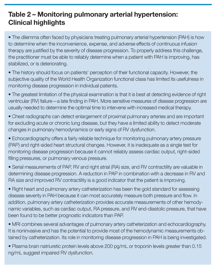 Another generalization may be worth keeping in mind: Patients with PAH who are “straddling the fence” between better and worse after several months of therapy are more likely to decline than to slowly improve. When it doubt, it is better to assume that a patient’s condition is worsening until repeated testing demonstrates otherwise. Table 2 presents clinical highlights of the monitoring process.