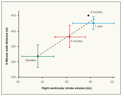 Figure 1 – The 6-minute walking distance improves as the right ventricular stroke volume increases in patients with pulmonary arterial hypertension who were treated for 12 months with epoprostenol. (Adapted from Roeleveld RJ et al. Chest. 2004.3)