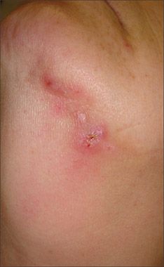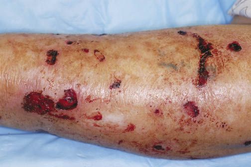 Skin lesions are noted on the arms and legs of a 54-year-old woman with type 2 diabetes mellitus and hypertension. The lesions are itchy and are aggravated by the patient’s “rubbing” them. Multiple lesions are identified all over her body in no specific pattern; however, they are bilateral and symmetric and in different stage of healing.