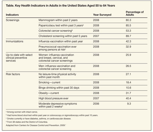 1. Centers for Disease Control and Prevention; American Association of Retired Persons; American Medical Association. Promoting preventive services for adults 50–64: community and clinical partnerships. http://www.cdc.gov/ aging. Published November 19, 2009. Accessed November 19, 2009.