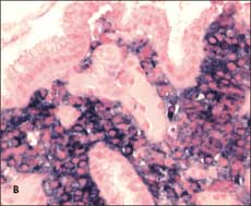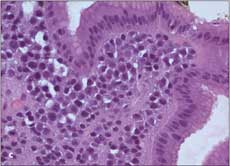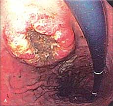 More than 80% of localized extramedullary plasmacytomas are found in the upper respiratory tract.2 About 2% to 5% of all extramedullary plasmacytomas are located in the stomach (gastric plasmacytomas).2 These tumors usually present with epigastric pain, weight loss, anorexia, and occult blood loss but rarely with upper GI hemorrhage,2 as in this case. Gastric plasmacytomas typically resemble carcinoma and are classified as nodular, polypoid, ulcerative, or infiltrative.3 Biopsies must be obtained to confirm that the lesion is indeed a plasma cell tumor, and additional testing must be performed to differentiate localized extramedullary plasmacytoma from diffuse multiple myeloma.