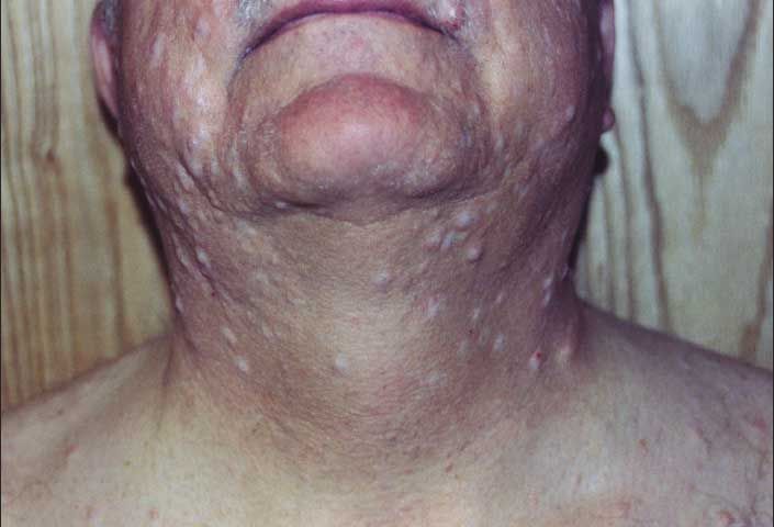 A 62-year-old man had multiple, randomly distributed, flesh-colored nodules on his trunk, arms, and face. The lesions measured 0.5 to 1.0 cm and appeared slightly pedunculated. Tissue biopsy showed Schwann cells.