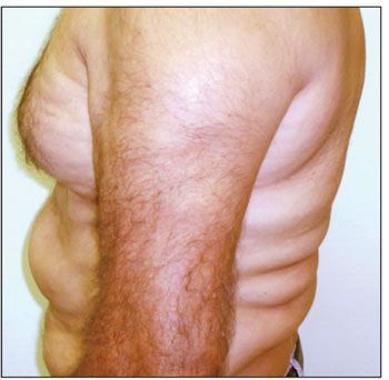 MSL predominantly affects middle-aged men of Mediterranean origin.1 The disease is characterized by diffuse accumulation of painless unencapsulated lipomas most commonly located in the subcutaneous tissue of the cervical, deltoid, thoracic, abdominal, and lumbar regions. Because of the symmetry of the masses, the condition is often mistaken for obesity, although the uninvolved areas in patients with MSL may appear emaciated by contrast.