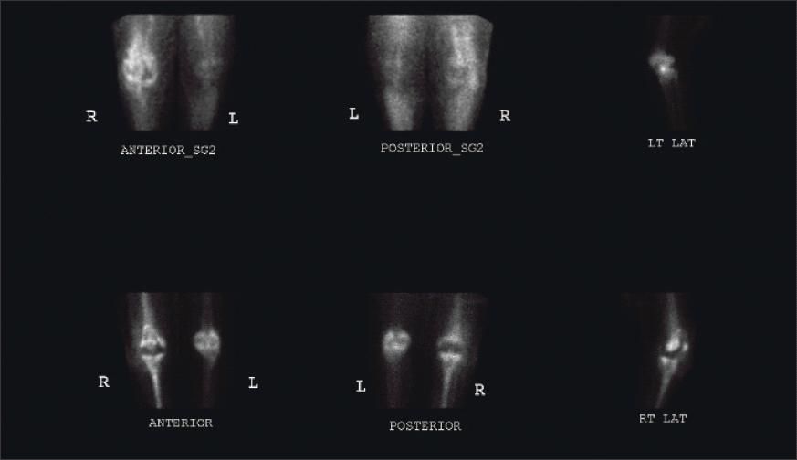Triple-phase, technetium-99m bone scans show intense delayed uptake in the right patella and tibia.