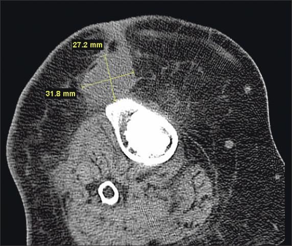 A CT scan of the right knee demonstrates a low-density soft tissue mass anterior to the tibial tuberosity. The bone demonstrates mild irregularity.