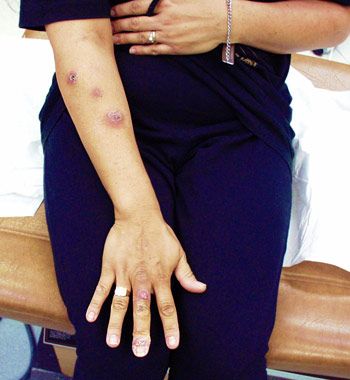 Key point: The history and clinical appearance are typical for the “sporotrichoid” spread of an infection. This most notably occurs with sporotrichosis, but may also been seen in conjunction with atypical mycobacterial infection, leishmaniasis, and tularemia, as well as other infections. Assuming that the patient helped provide maintenance for the aquarium, atypical mycobacterial infection should be highly suspect. In fact, tissue obtained from both the hand and arm lesions grew Mycobacterium marinum. Treatment: Oral minocycline (200 mg/d) was given until the lesion resolved in 10 weeks.