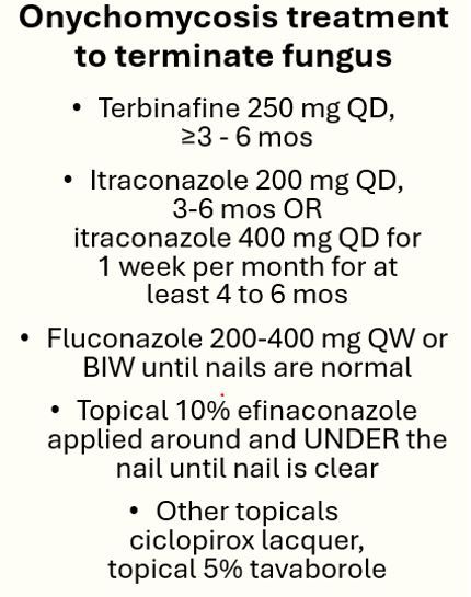 Itraconazole is another option with dosing recommended at 200 mg daily for 6 to 8 months (note: pay attention to labeling updates). Elewski is a fluconazole fan and approaches her patients with the "Fungal Friday" regimen:200 to 400 mg once or twice weekly until nails are normal.