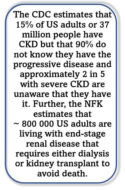 In its early stages, kidney disease is asymptomatic and so often not intensively managed until an individual has progressed to kidney failure, according to the NFK. The CDC estimates that 15% of US adults or 37 million people have CKD but that 90% do not know they have the progressive disease and approximately 2 in 5 with severe CKD are unaware that they have it. Further, the NFK estimates that approximately 800 000 US adults are living with end-stage renal disease that requires either dialysis or kidney transplant to avoid death. CKD is more common among people aged ≥65 years, leading to annual Medicare costs exceeding $153 billion.