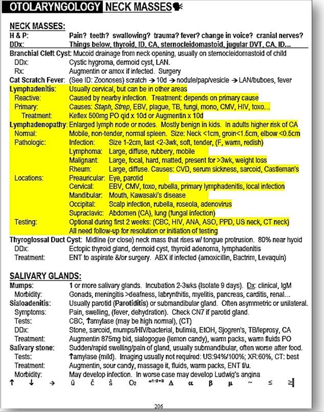 Neck masses and lymphadenopathy have many potential causes which can be narrowed by location, size, degree of pain and/or tenderness, and duration. Infectious causes tend to be painful and typically resolve within a few weeks, especially if treated with the appropriate antimicrobials. Malignant and rheumatologic causes tend to be less painful or painless and persist beyond 2 to 3 weeks. (See highlighted area of sample page at end of article for relevance of location of the enlarged nodes. Other causes of neck masses are included in the non-highlighted areas.)