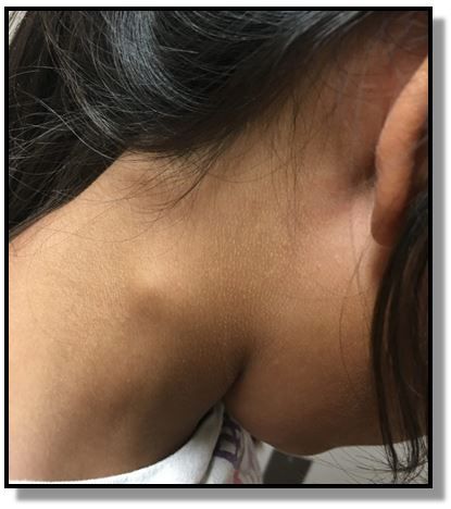 History of present illness. A 5-year-old girl is brought to the emergency department for 5 days of cough and 2 days of painful right posterior neck swelling. The parents deny any fever, sore throat, dyspnea, or other swollen nodes they have noticed. She has no significant past medical history.