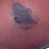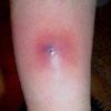 The classic CA-MRSA lesion appears as an area of cellulitis around a darker purpuric center with overlying dermonecrosis (Figure 7). The central necrosis of the CA-MRSA lesion, unlike that of the brown recluse spider bite, is usually slightly raised from the surrounding skin, because of edema or an underlying abscess. Patients with a CA-MRSA infection who claim to have a spider bite rarely report feeling a bite or seeing a spider and often admit that a friend or family member suggested this was the cause.