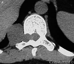 An otherwise healthy 34-year-old man presented with lower thoracic and right flank pain that followed a T10 dermatomal pattern. The axial CT image at the level of T10 seen here showed a soft tissue mass widening the neural foramen on the right and extending in a paraspinal location. The pathologic diagnosis of the resected mass was slow-growing fusiform neurofibroma without the plexiform changes frequently seen in type 1 neurofibromatosis, the hallmark lesions of which are caf au lait macules and multiple firm, subcutaneous neurofibromas.