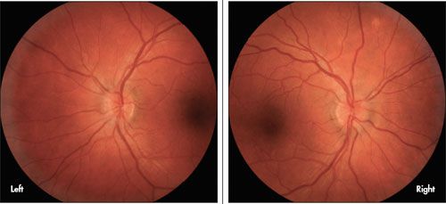 A 36-year-old man had noticed a dark spot in the field of vision of his left eye. A complete workup was unremarkable except for an elevated C-reactive protein level and a mild prominence of the left hilum on his chest radiograph. Examination of the optic discs through dilated pupils revealed bilateral papilledema, more prominent at the nasal disc margins. A transbronchial biopsy demonstrated non-necrotizing granulomas, which confirmed a diagnosis of neurosarcoidosis.