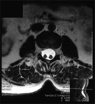 A 42-year-old woman had a “life-long” history of low back pain, without radiation, anesthesia, weakness, or incontinence. An MRI scan without contrast of the lumbar spine revealed a sagittal division of the spinal cord into 2 halves at the L2-3 level separated by a cartilaginous septum, or diastematomyelia, a rare congenital neural-tube defect.