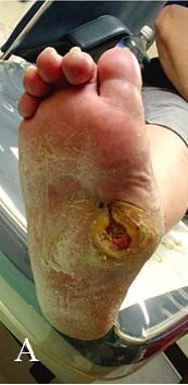 A patient with a chronic Charcot foot has the typical "rocker bottom foot" with a noninfected neuropathic ulcer on the bottom of the midfoot resulting from increased pressure from ambulation. There is increased hyperkeratotic skin around the ulcer.