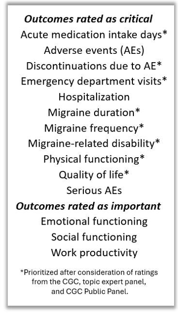 The study authors evaluated the impact of treatments on migraine frequency and duration, days that medication was taken for acute treatment, frequency of migraine-related emergency department visits, migraine-related disability, quality of life and physical functioning, and discontinuations due to adverse events (AEs). The AEs themselves were culled from FDA labels and eligible studies, and the economic value (evidence) was based on willingness-to-pay thresholds.